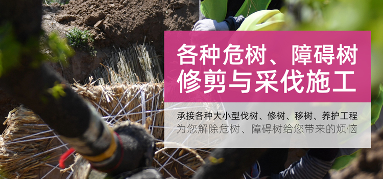 本公司具有高水平的施工隊伍、先進的采伐工具,高超的高空作業(yè)技術(shù)、誠信的服務(wù),完善的管理。常年承接各種大小型伐樹、修樹、移樹、養(yǎng)護工程。常年為各大倉庫、部隊院校、工廠和小區(qū)物業(yè)進行樹木的修剪及采伐施工,為您解除危樹、障礙樹給您帶來的煩惱,真誠尋求各單位綠化隊的合作與支持。
